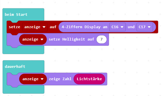 Als erstes muss das Vier-Ziffern-Display an den zweiten Grove-Connector angeschlossen werden. Deshalb lautet die Einstellung C16 und C17.